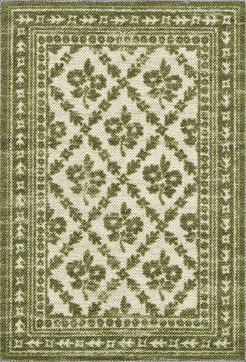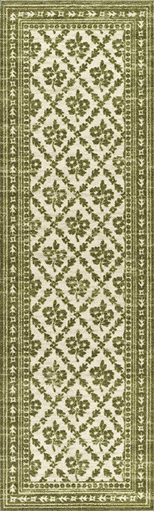 This freshly-botanical rug offers a modern take on traditional design, blending soft, but rigid floral motifs with a classic diamond pattern in a warm, earthy green palette. Subtle yet detailed, this rug brings a sense of quiet sophistication to any room—whether you're styling a cozy farmhouse, a cottage-inspired space, or a more transitional interior. The muted olive tones and delicate florals lend a vintage charm that feels both timeless and effortlessly inviting. Perfect for layering into cottage core living rooms, bedrooms, or hallways, it delivers a balanced mix of elegance, comfort, and natural, sophisticated beauty.