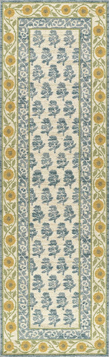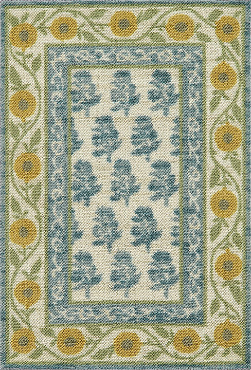 This joyful rug is a celebration of pattern, color, and timeless but playful charm. Its soft blue floral block print is framed by a richly detailed, fruit-inspired border in warm golden tones—evoking the look of vintage textiles and orchard harvest motifs. This design feels both fresh and nostalgic, blending classic folk art influences with a light, airy sensibility that fits beautifully in today’s homes. Perfect for cottage core interiors, farmhouse settings, or anyone drawn to curated, lived-in style, this Bibury rug brings personality and softness to every room. Whether placed in a cozy kitchen, sun-drenched hallway, or layered under a reading nook, this rug adds a storybook touch—full of warmth, whimsy, and graceful detail.