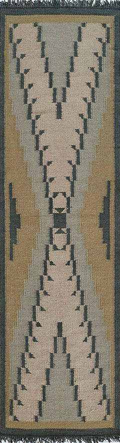 This striking deep blue rug was heavily influenced by patterns found in Southwest Native American and Indonesian cultures. Hand-woven using wool fibers and leather accents, this design offers a more interesting take on stripes, incorporating tribal inspired motifs along the way. The fringe tan leather detailing on either end lends a warm touch to its otherwise cool, rich hues.