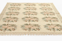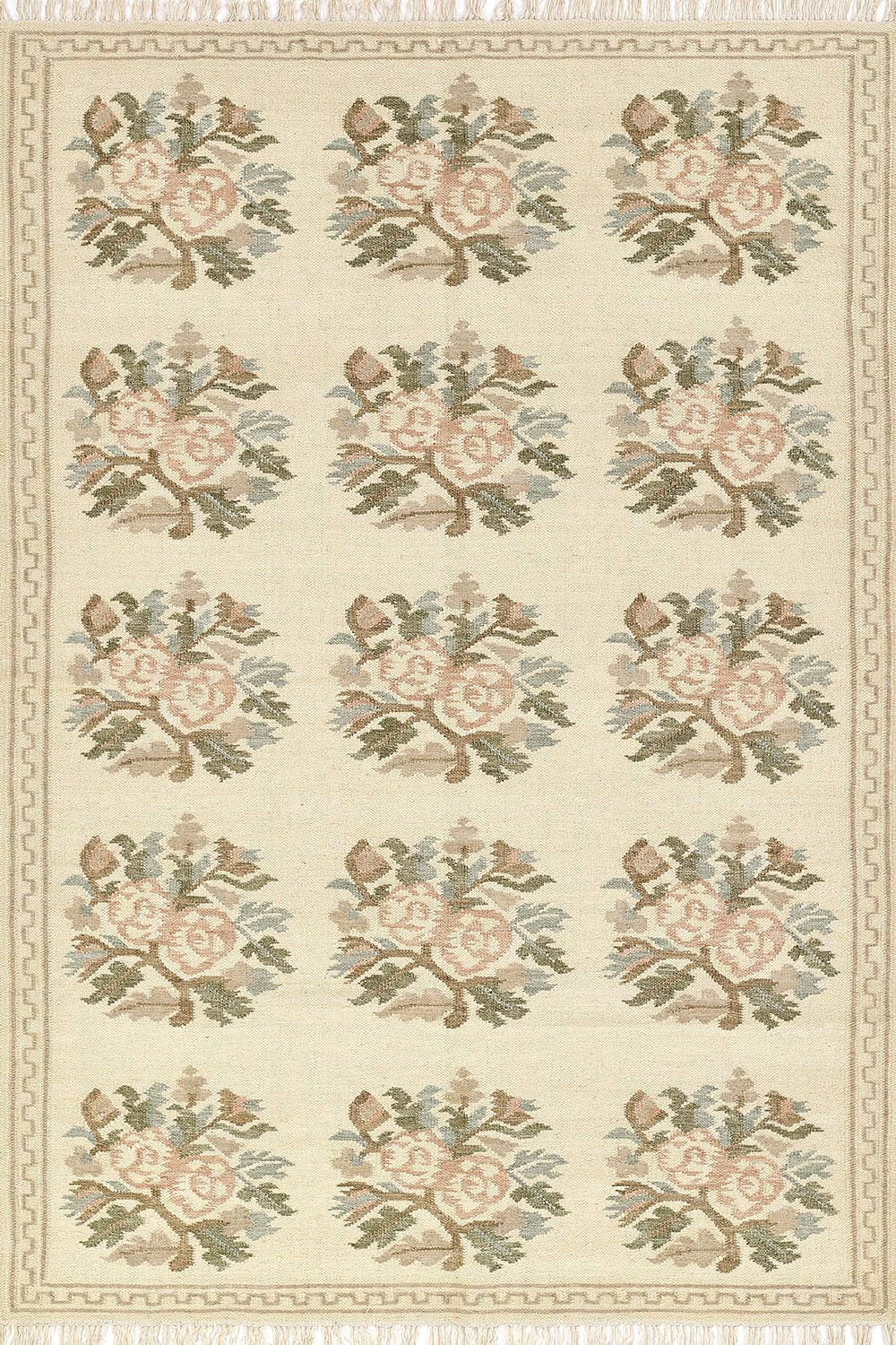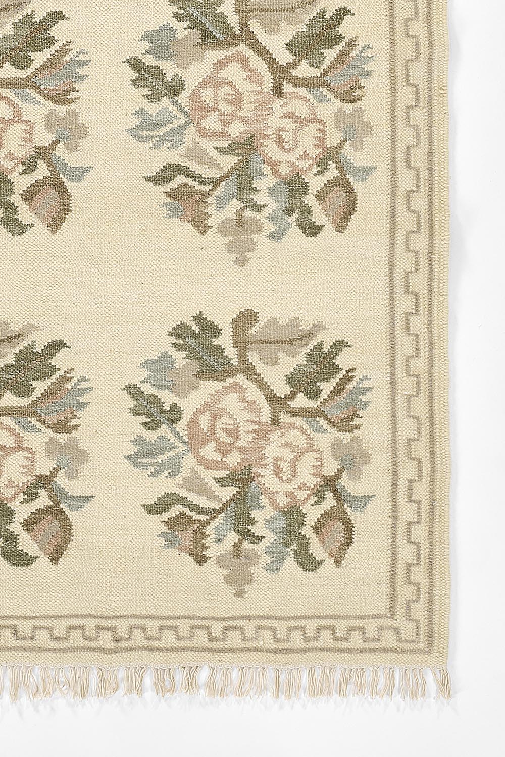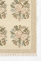 Graceful and nostalgic, this light and airy rug captures the essence of vintage femininity. Inspired by traditional Bessarabian textiles, its bouquet-style rose motifs bloom softly across a stone blue background, accented by the classic blush tones of the rose. The hand-woven wool construction adds a layer of artisanal texture, while the fringed edges and classic border lend an elegant, collected feel. Whether anchoring a romantic bedroom or adding warmth to a refined sitting room, this rug offers timeless sophistication with a gentle, cottagecore sensibility.
